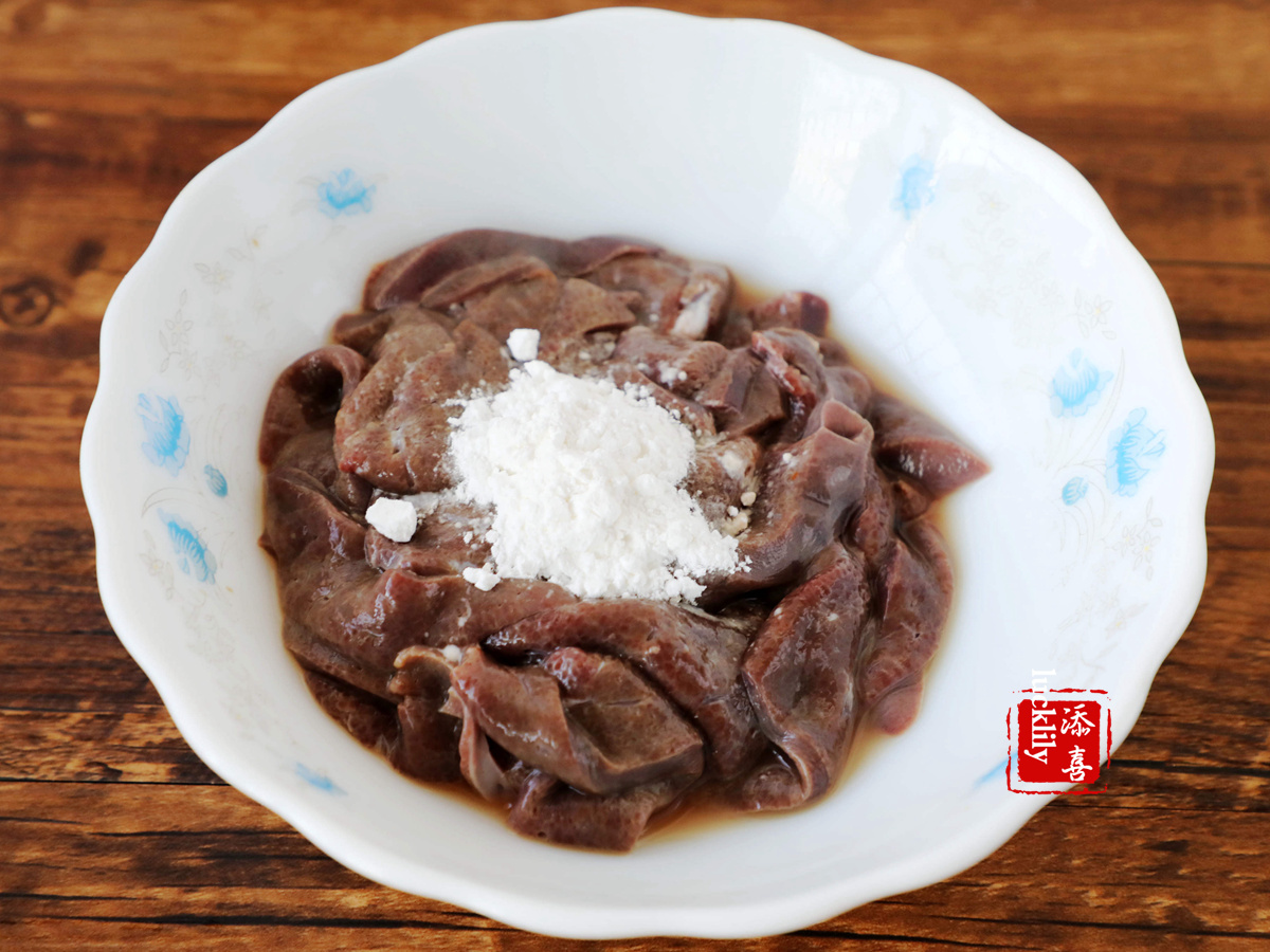 豬肝要挑色澤新鮮的買,買回來之后也用清水多沖洗幾遍,沖洗掉血水,然后用料酒、淀粉拌勻,靜置半小時左右,這樣的豬肝炒起來口感就比較嫩滑。