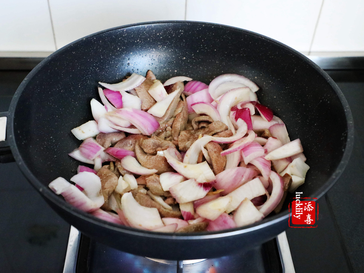 再加入洋蔥、蔥段兒一起翻炒。
