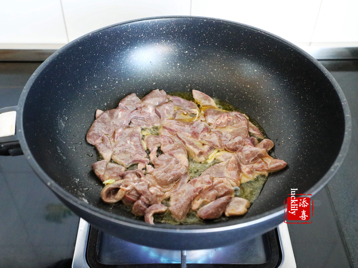 起油鍋,先下姜絲豬肝翻炒。