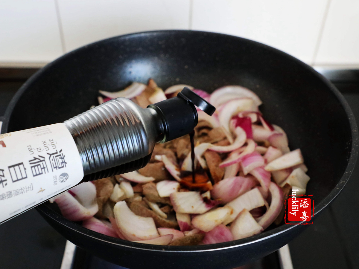 另一種做法是豬肝先下油鍋,翻炒至七八成熟盛出,然后再起油鍋,下洋蔥翻炒至快熟時將豬肝倒入共同翻炒,并加醬油,兩種方法都是可以的,口感也相近。