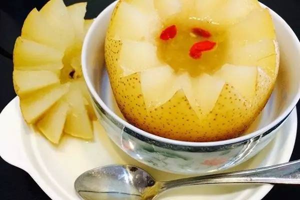 2、把冰糖和洗凈的枸杞放入中間,蓋上蓋子,把處理好的雪梨放入深盤或深碗,蒸好的梨會流出很多甜湯,最好選深一點的容器來蒸。