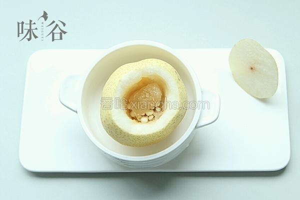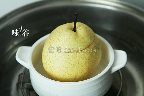 4.將雪梨放入碗中,加冰糖、水,隔水蒸30分鐘即可。