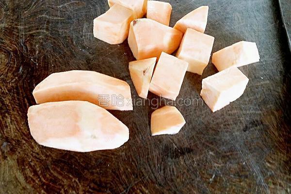 2.紅薯在案板上切成麻將大小的塊