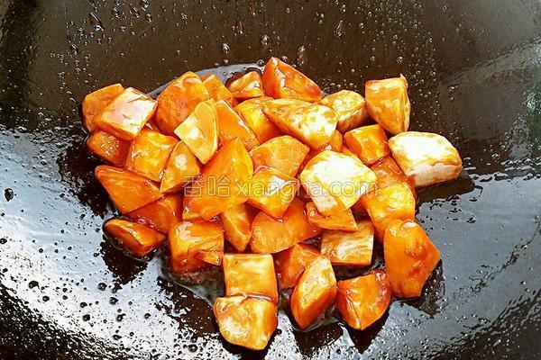 9.接著,把炸好的紅薯塊倒入鍋內(nèi),掂鍋把紅薯塊翻均勻,讓糖漿都包裹在紅薯上,然后出鍋裝盤。這道美味的“拔絲紅薯”就做好了。如想扒出更多的絲,可用筷子蘸糖漿扒出更多的絲來