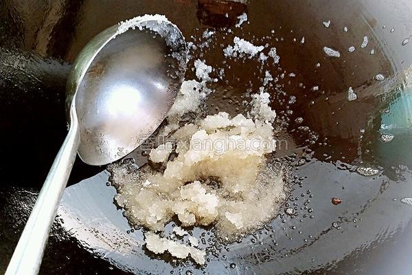 6.把鍋內(nèi)的油倒入油盆,鍋內(nèi)留余油少許,接著把準(zhǔn)備好的白糖倒入鍋內(nèi)。開小火,把白糖炒化熬成糖漿