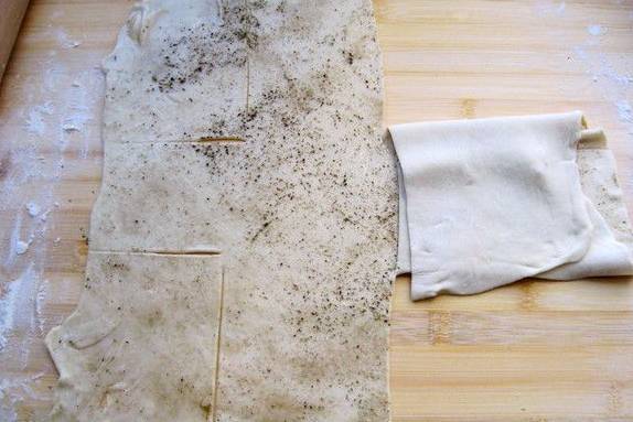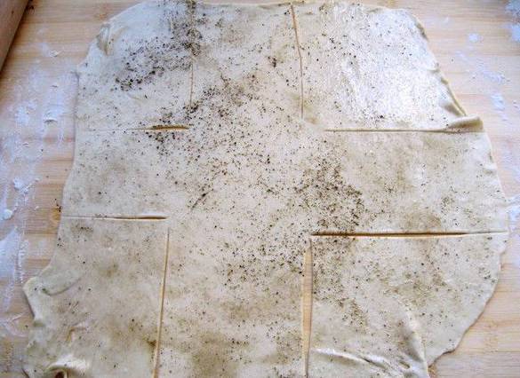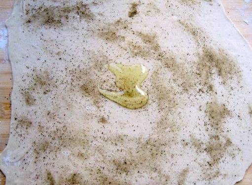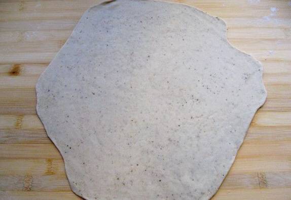 4.餳好的面團(tuán)分為兩份,喜歡吃特別薄的也可以分為三份。搟成比較薄的片,刷一層油,撒上花椒粉,倒上適量的油