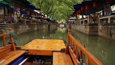 在水鄉(xiāng),最親近水的方式是乘船。坐著早已泛出古木光澤的小船,搖過一座座橋,欣賞著兩岸的高墻深院,靜靜品味水鄉(xiāng)的寧靜,心中的嘈雜也不知去向。“舟行碧波上,人在畫中游”的愜意就是這般滋味吧!