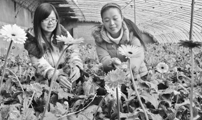 圖為大學(xué)生村官臧一潔(左)和田彩虹正在采收非洲菊。張玲攝
