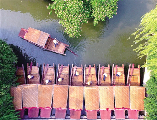 6月15日清晨,往來于山東棗莊市臺兒莊古城水街水巷里的搖櫓船,與小橋、流水、垂柳、古色古香的建筑相融合,呈現(xiàn)出“水鄉(xiāng)船韻”詩情畫意般的景致。 高啟民攝