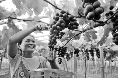 近日,游客在河南寧陵縣城郊鄉(xiāng)李子薦村國民種植專業(yè)合作社20畝無公害有機(jī)葡萄采摘園里采摘葡萄。