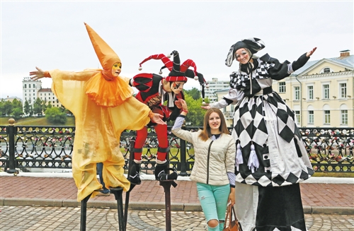 第26屆“斯拉夫巴扎”國際藝術(shù)節(jié)日前在白俄羅斯維捷布斯克市開幕,藝術(shù)節(jié)舉辦歌舞比賽、民族手工藝品展等精彩文藝活動。圖為一名游客與街頭藝人合影。 新華社記者 魏忠杰攝