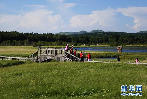 游客在塞罕壩國家森林公園七星湖景區(qū)游玩(7月11日攝)。塞罕壩國家森林公園位于河北承德市境內(nèi),以其林海、草原和湖泊等景致,吸引眾多游客前來游玩。 新華社記者 王曉 攝