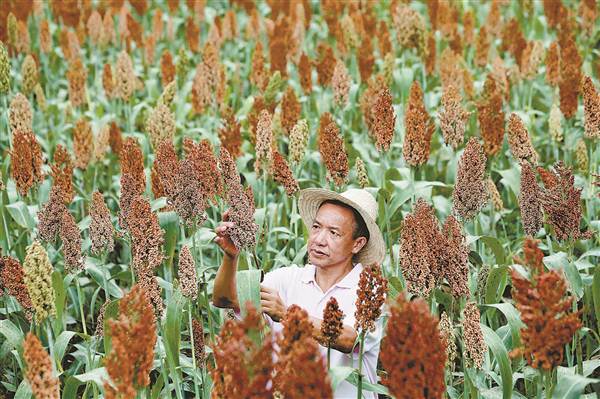 在黔江區(qū)阿蓬江鎮(zhèn)青杠村攀攀農(nóng)業(yè)開(kāi)發(fā)公司高粱種植基地,村民在查看高粱的成熟情況。特約攝影 楊敏