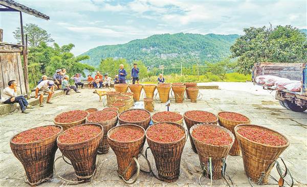 豐都縣武平鎮(zhèn)白集山村,村民正在交售辣椒。8月中旬以來(lái),白集山村雙合辣椒專業(yè)合作社317戶社員地里的辣椒成孰了,進(jìn)入銷售旺季。目前,當(dāng)?shù)乩苯蜂N售價(jià)格看好,村民每畝辣椒收入可達(dá)4500元左右。通訊員林登周 攝