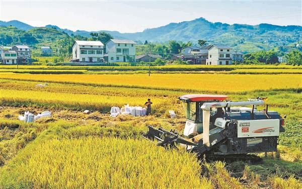 綦江區(qū)扶歡鎮(zhèn)小卷洞村,收割機(jī)在稻田里來(lái)回穿梭,收割、脫粒、裝車一氣呵成。特約攝影 陳星宇
