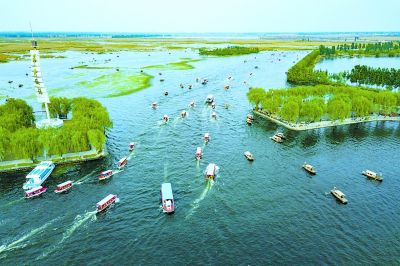 4月30日,游人乘坐游船欣賞白洋淀的美景(無人機拍攝)。