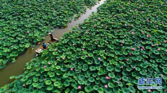 7月12日,游客在河北省灤南縣北河公園內(nèi)乘船觀賞荷花(無人機拍攝)。盛夏時節(jié),河北省灤南縣北河公園里荷花競相綻放,進入最佳觀賞期,吸引了眾多游客和市民前來觀賞。 新華社記者 牟宇 攝