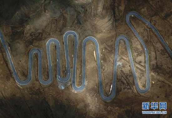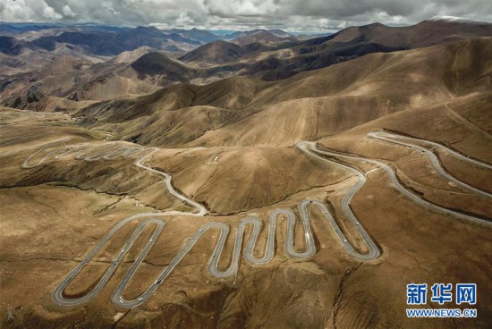 修筑于西藏日喀則市定日縣群山峻嶺間蜿蜒曲折的公路(7月24日無人機(jī)拍攝)。