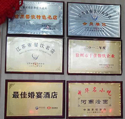 徐州四季紅餐飲有限公司嚴(yán)格按照星級標(biāo)準(zhǔn)改建裝修的大型餐飲酒店。自開業(yè)數(shù)年以來,秉承客戶至上,賓至如歸的經(jīng)營理念,深得廣大消費(fèi)者的喜愛。被中國烹飪協(xié)會(huì)評定為中華名小吃“河南燴面”榮譽(yù)稱號(hào)、“江蘇省餐飲行業(yè)協(xié)會(huì)會(huì)員單位”、 ”江蘇省餐飲名店”、“最佳婚宴酒店”、“徐州餐飲特色名店”、“徐州十佳餐飲名店”等榮譽(yù)。