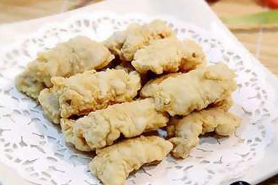 8.  把腌好的肉片逐一沾好酥炸糊,然后下入四成熱的油鍋中進(jìn)行炸制。