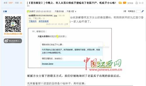 網(wǎng)友在某論壇爆料稱在瓜子里發(fā)現(xiàn)老鼠