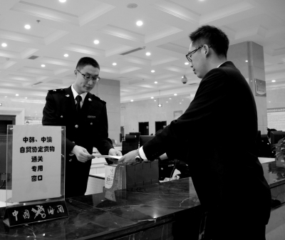 ▲昨天,貨代公司工作人員向青島大港海關(guān)工作人員遞交《中韓自貿(mào)協(xié)定》正式生效后中國首票進(jìn)口貨物報(bào)關(guān)單。 新華社發(fā)