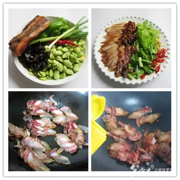 蠶豆200克、臘肉90克、干辣椒3個、鹽適量、雞精適量、青椒1個、青蒜4棵、生姜1克、生抽2克、蠔油一勺