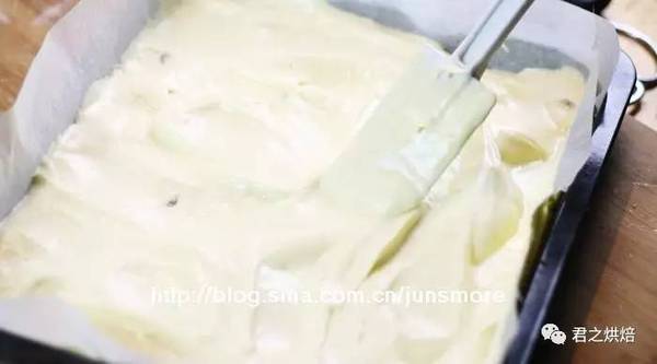 3、將面糊倒入鋪了烤盤紙的烤盤里,抹平,把烤盤放入預熱好180度的烤箱,烤15-20分鐘,直到表面金黃色。
