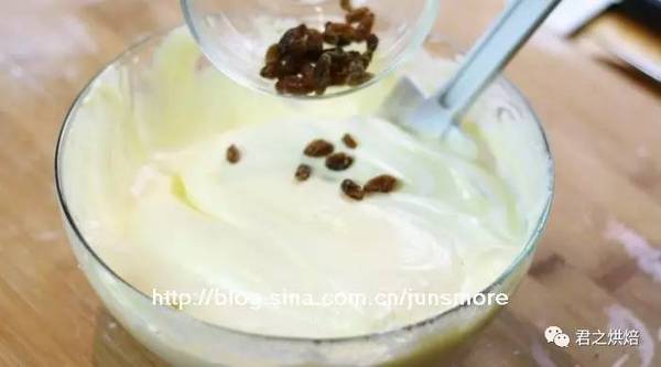2、葡萄干放入碗里,倒入能沒過葡萄干的朗姆酒,浸泡半個小時,再瀝干水分。根據戚風蛋糕的做法(點擊這里),制作好戚風蛋糕面糊(做片狀蛋糕的蛋清只需要打發(fā)到濕性發(fā)泡),在面糊做好后,倒入葡萄干,稍稍拌勻。