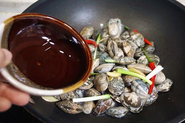4、倒入花蛤,快火翻炒一下,煮2分鐘。
