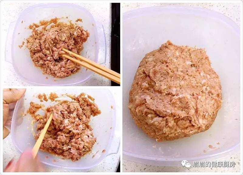 5、再用筷子使勁朝一個方向攪拌,一直攪拌到肉末起勁,這個過程有點(diǎn)費(fèi)力氣,一定要攪拌到肉泥變得粘稠上勁;