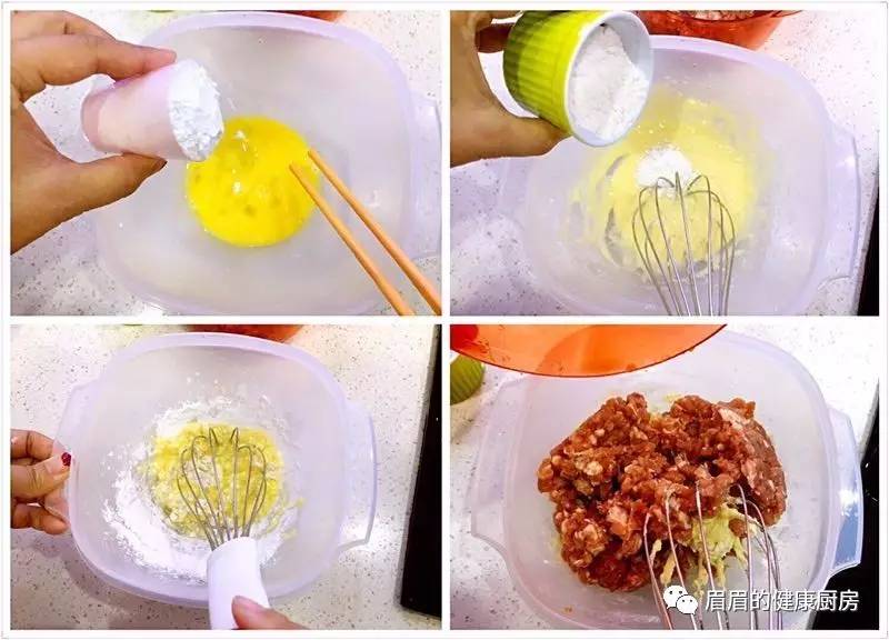 3、雞蛋打散,加入淀粉,面粉,用特百惠手動打蛋器攪拌均勻無顆粒狀,再倒入肉末拌勻;