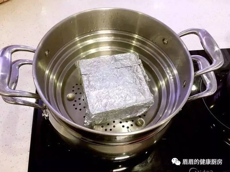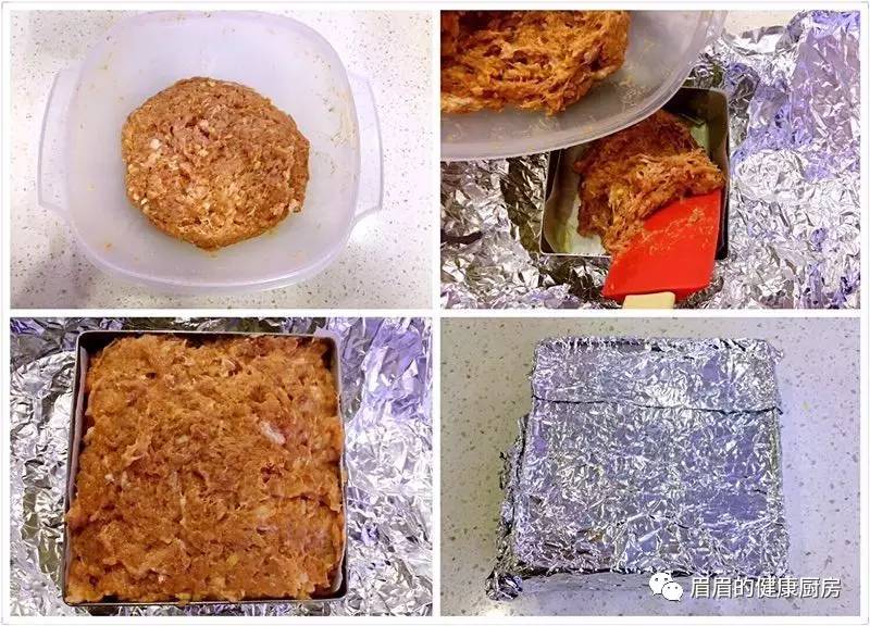 6、容器中刷上一層植物油,再倒入肉泥,壓實(shí),再蓋上錫紙;