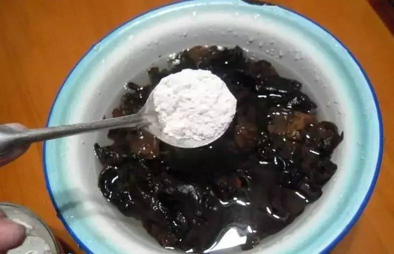 在洗木耳的水中,加入一勺面粉,順著一個方向攪拌幾下,靜置十分鐘左右再清洗。