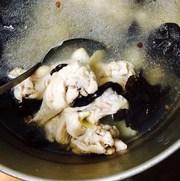 1. 雞腿肉焯熟,放在冷水中冷卻5分鐘,用熱水泡發(fā)木耳;