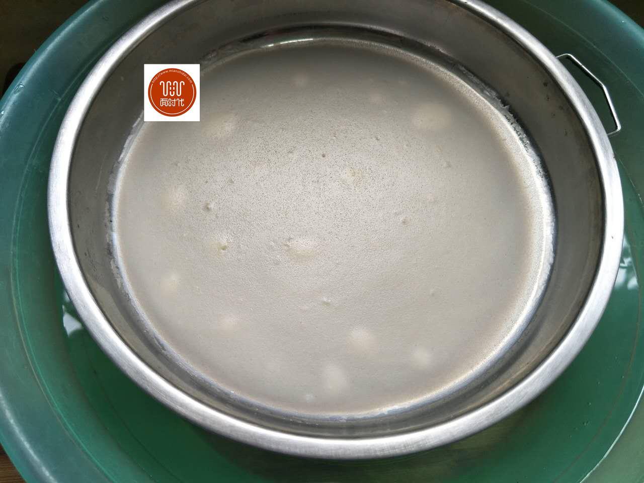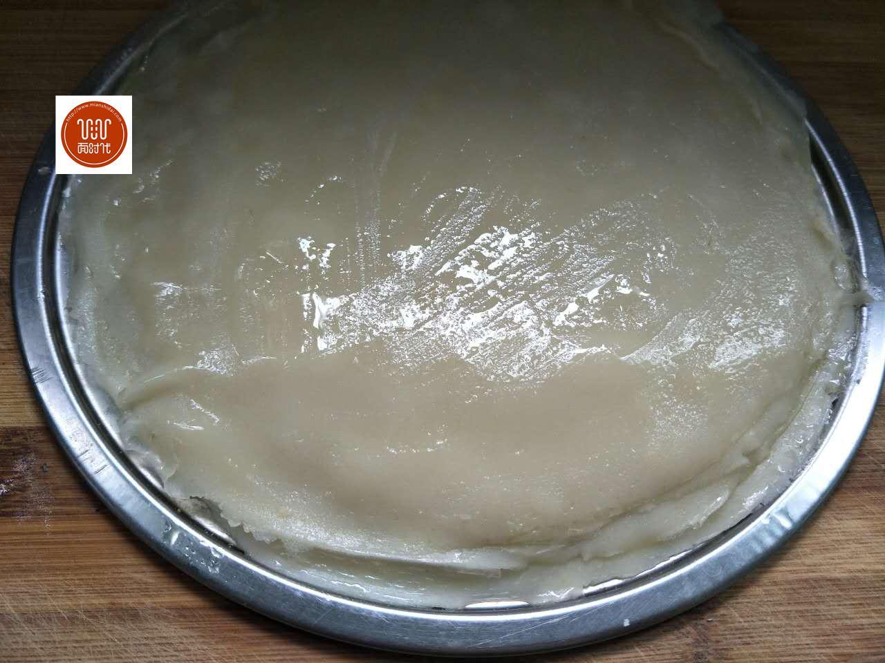 6、開始蒸涼皮,涼皮鑼刷一層薄油,舀一勺面漿,倒入涼皮鑼,(喜歡吃薄一點的可以少加一些面水,喜歡厚一點的多加一點,根據(jù)自己的口味選擇)。