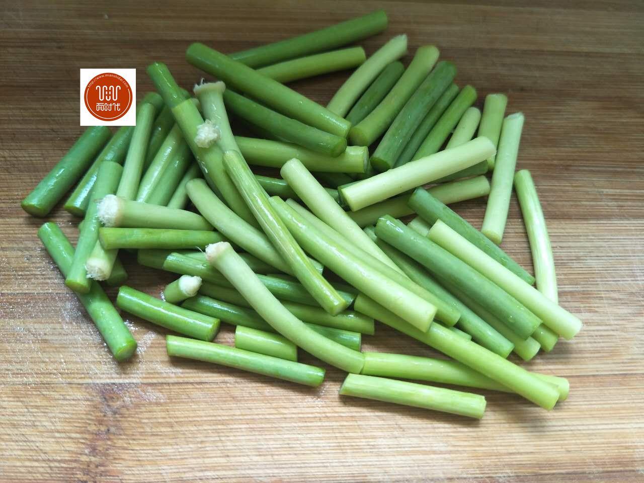 6、將蒜薹倒入鍋中,等茄子大部分變成透明,蒜薹也變得油綠出香味,盛出待用。