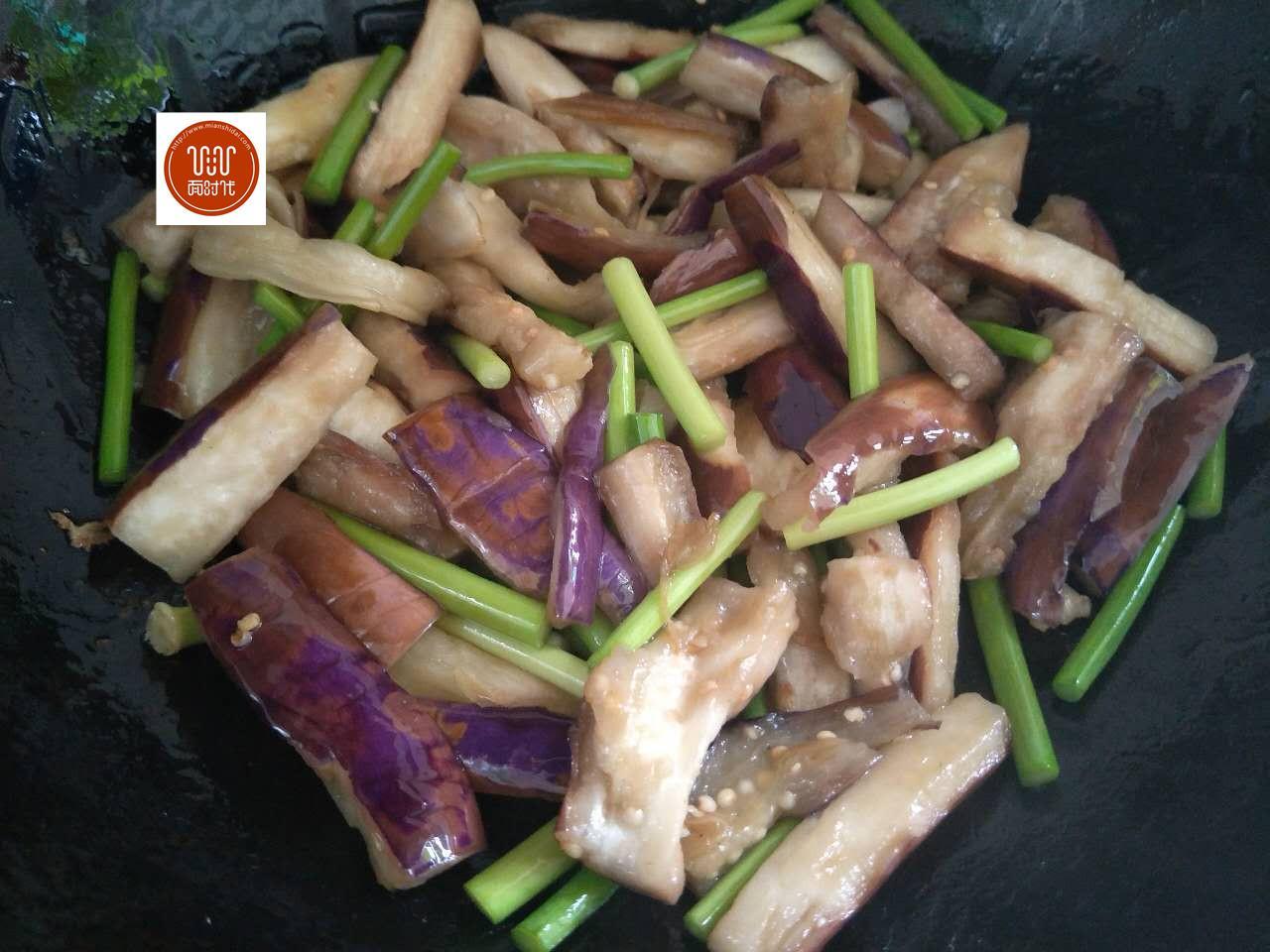 8、將茄子蒜薹倒回鍋中,翻炒均勻,不需要再加鹽了。