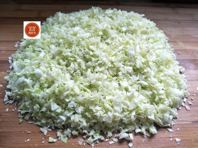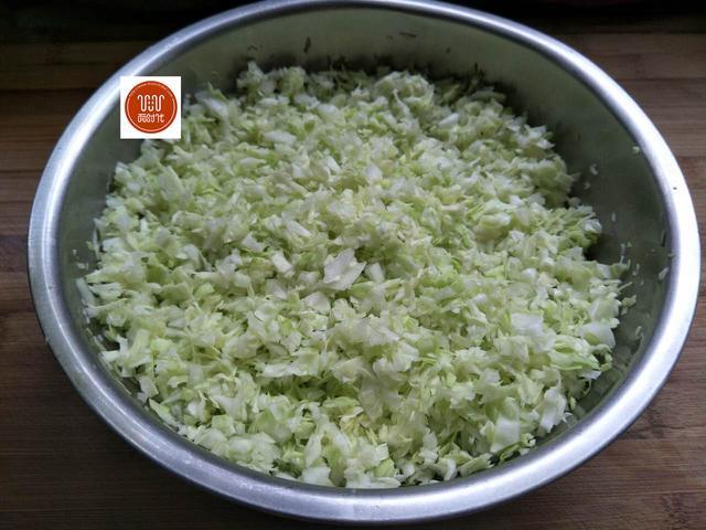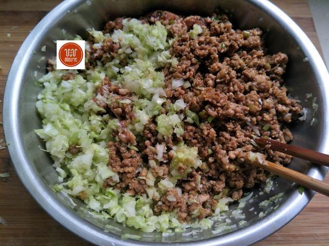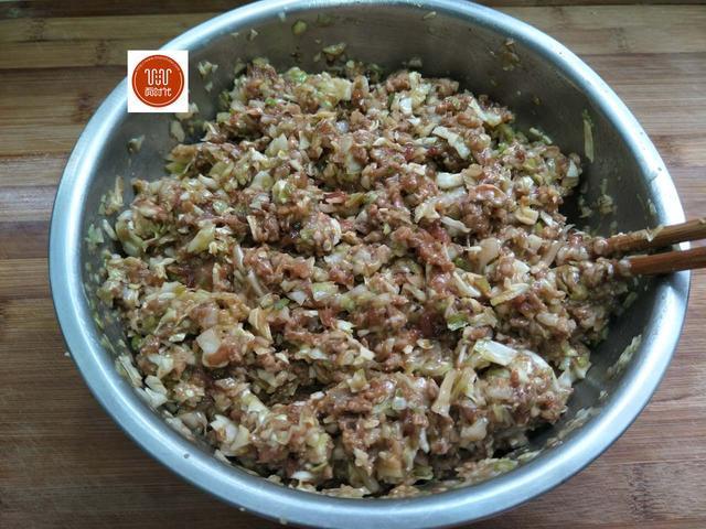 9、包菜攥去水和拌好的肉餡和炒好的肉餡混在一起拌勻。