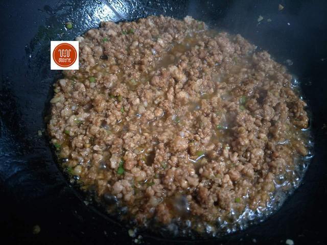 8、 炒鍋中倒油,將一半肉餡入鍋中煸炒變色,將蔥花煸炒出香味,加入適量的醬油,鹽,大醬調(diào)色調(diào)味。
