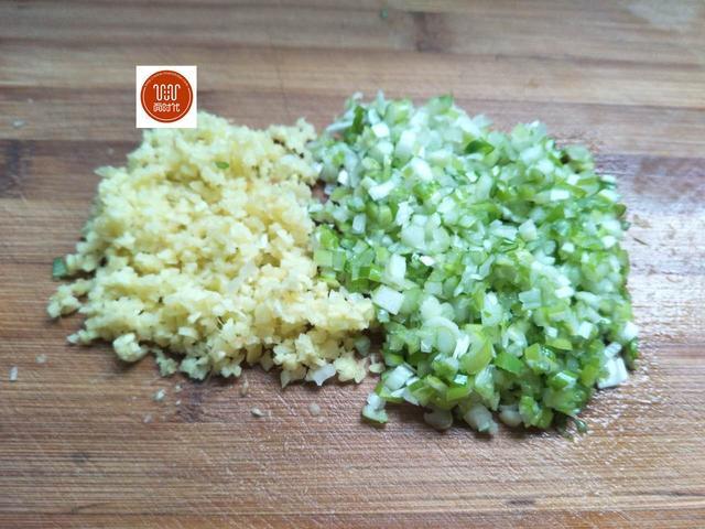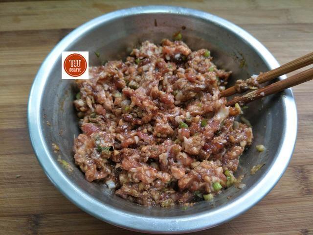 7、 將一半的生肉餡加少許水?dāng)噭蛑磷虧?rùn),放入蔥花,姜末,醬油,料酒,食用油,鹽順時(shí)針攪勻。