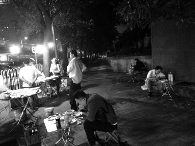在橋東南側(cè)的路邊,也有一個(gè)小吃攤?恐愤叺蔫F欄桿支著兩張圓桌,一張桌上放著餡料和餃子,另一張桌上放著幾盆涼菜。地上有兩個(gè)泡沫箱摞在一起,鐵欄桿上還掛著幾個(gè)大塑料袋,旁邊的樹(shù)上掛著兩盞燈,光線刺眼。街邊停著兩輛出租汽車(chē),車(chē)熄了火,頂燈亮著,兩名身穿黃色襯衣的“的哥”正在攤位的小桌旁吃飯。