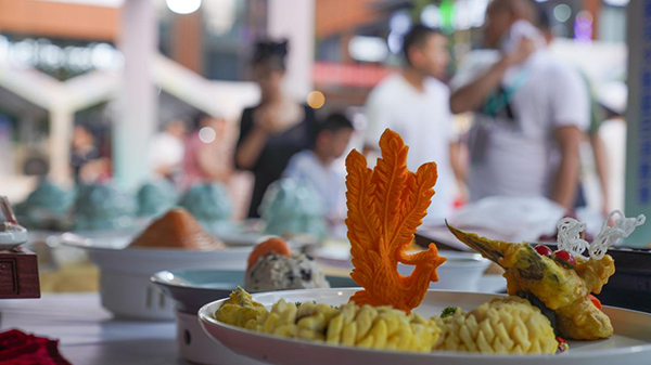 7月11日,山東省鄒平市舉行的第三屆齊魯小吃文化節(jié)暨黃河大集夏日消費(fèi)季活動現(xiàn)場的宴席展區(qū),鄒平市的鑫宇酒店展示的地方特色宴席。