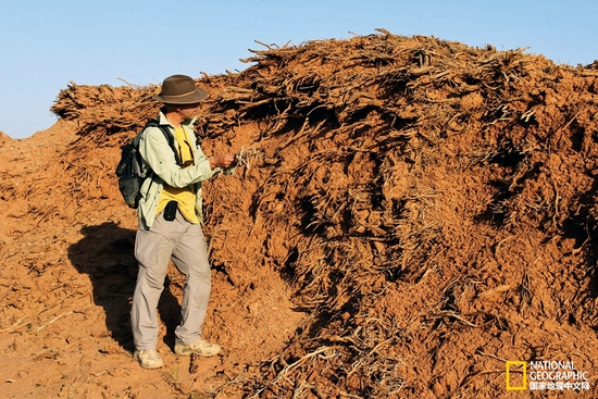 威廉•林賽在觀察一段保存完好的“長(zhǎng)城”里的樹枝。墻體最高處2.5米左右,里面混雜著很多梭梭木。為了做碳測(cè)年的目的,林賽在這段墻體的底部、中部和上部分別抽取了樣品。最終碳測(cè)年的結(jié)果顯示,這些樣品均出自于公元1042年至1151年期間。