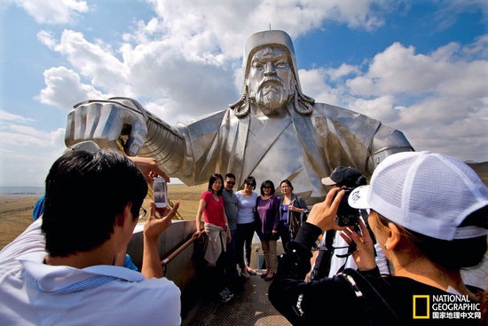 幾個(gè)中國(guó)游客正在成吉思汗塑像前合影留念。據(jù)說這是世界上最大的不銹鋼塑像,高40米,用材250噸。成吉思汗騎在戰(zhàn)馬上,馬蹄下面是一個(gè)博物館。從馬身向上有一個(gè)樓梯,走到樓梯頂頭,就是位于馬的頭部的一個(gè)平臺(tái),供人合影留念。整個(gè)設(shè)施建成于2008年,距離蒙古首都烏蘭巴托50公里。