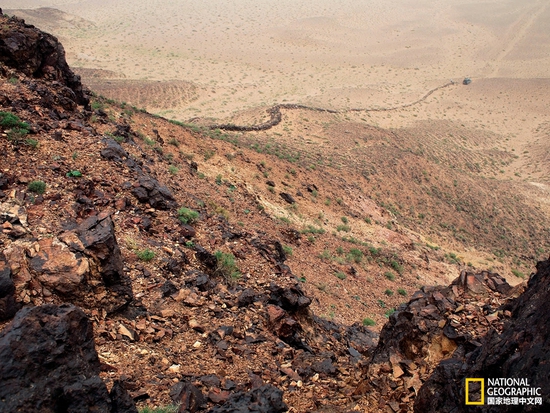 實(shí)際上的路途遠(yuǎn)比我們想象的要遠(yuǎn),我們開了整整20分鐘才來到一個(gè)陡峭的斜坡邊。這是沙海中的一座黑色的火山巖島,泥土建成的邊墻到這里后立即在形狀和樣式上發(fā)生改變,建造者使用從火山坡上取得的火山巖塊。墻曲折蜿蜒,在光禿禿的灰色山坡顯得格外顯眼,就像山頂?shù)幕鹕娇诹魈食龅耐募变鰷u。