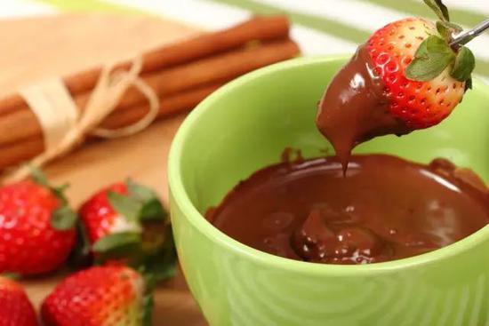 瑞士是盛產(chǎn)巧克力的國度,所以這一美食也被用在了“火鍋”中。巧克力火鍋和奶酪火鍋的食用方法相似,用溫火將搗碎的巧克力和少量甜酒、奶油一同煮成汁后,便可以用長柄叉插上切成塊的水果蘸著巧克力汁食用了。甜甜的巧克力裹在清脆可口的水果外,吃起來分外享受,是很多女孩子喜愛的冬日美食。
