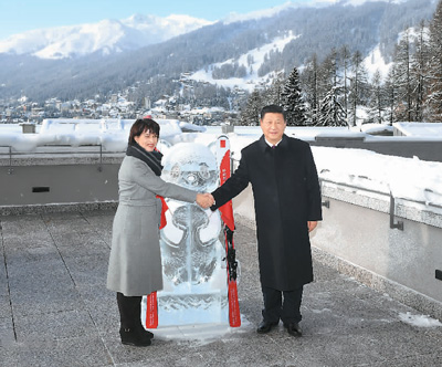 1月17日,國家主席習近平同瑞士聯(lián)邦主席洛伊特哈德在達沃斯共同啟動中瑞旅游年。兩國元首在熊貓冰雕像和印有中瑞兩國國旗及“中瑞旅游年”字樣的滑雪板旁合影留念。