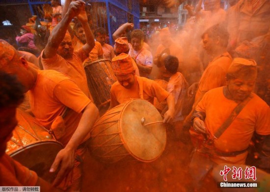 當地時間2017年4月15日,尼泊爾巴克塔普爾,民眾灑朱砂粉慶祝畢斯基(Bisket Jatra)節(jié)。據悉,該節(jié)日是尼泊爾的四大傳統節(jié)日之一,也被稱為“尼泊爾新年”。當地民眾會在此時互相拋灑朱砂慶祝新年。