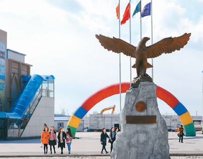游客近日在中哈霍爾果斯國際邊境合作中心哈薩克斯坦境內(nèi)的金雕中央廣場參觀。